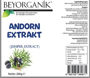 Der Beyorganik Andorn Extrakt 260g - Wacholder Sirup 260 g besteht aus sorgfältig ausgewählten Bio-Wacholderbeeren. Jede Beere wird nachhaltig geerntet und schonend verarbeitet, um das volle Aroma zu bewahren.